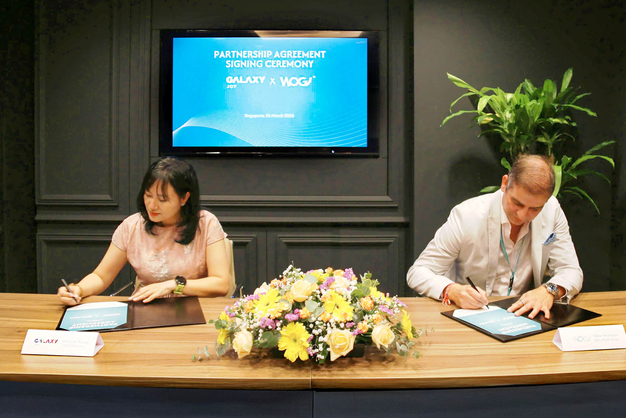 Bà Hoa Lan Hương, CEO của GalaxyJoy và ông Viktor Atanasov, CEO của WOGI, ký kết thỏa thuận hợp tác tại Singapore nhằm hỗ trợ mở rộng chương trình phần thưởng xuyên biên giới của Vietjet SkyJoy.